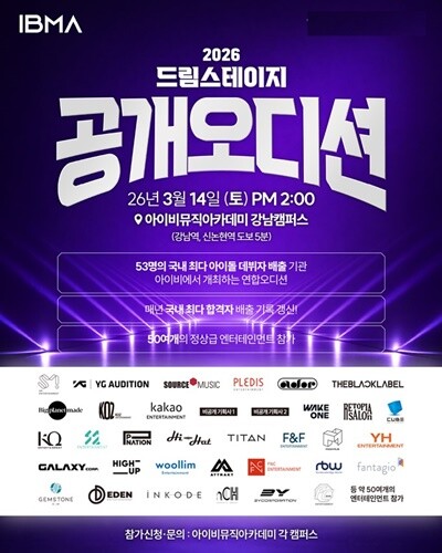 강남실용음악학원 아이비뮤직아카데미가 주관하는 ‘2026 드림스테이지 아이돌 공개오디션’이 오는 3월 14일(토) 서울 강남캠퍼스에서 개최된다. 이번 오디션은 국내 최정상급 엔터테인먼트사 50여 곳이 참여하는 대규모 연합 공개 아이돌 오디션으로, 아이돌 데뷔 및 연예계 진출을 꿈꾸는 지원자들에게 실질적인 기회를 제공할 예정이다.
