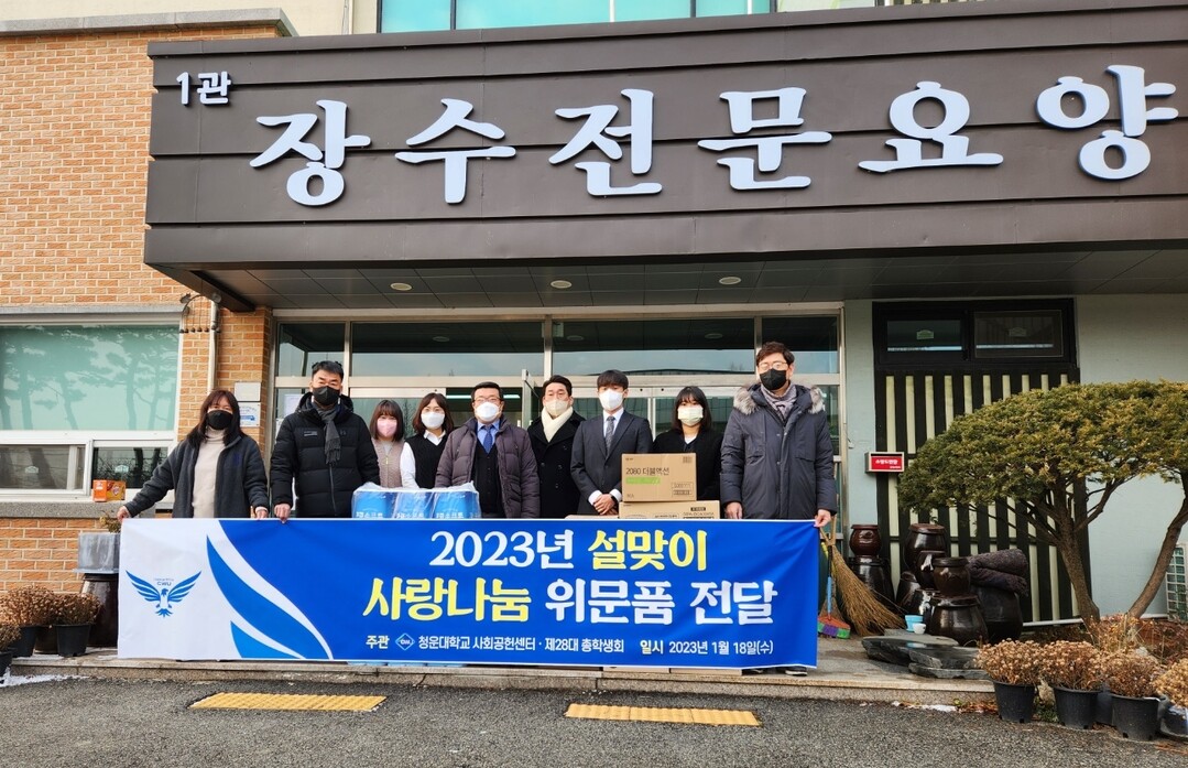 [대학저널 온종림 기자] 청운대학교는 사회공헌센터와 총학생회가 지난 18일 설을 앞두고 홍성군 관내 노인전문요양원 장수원과 중증장애인요양원 한누리, 아동보육시설 사랑샘을 방문하여 쌀과 세제, 화장지 등 생필품을 전달했다고 19일 밝혔다.