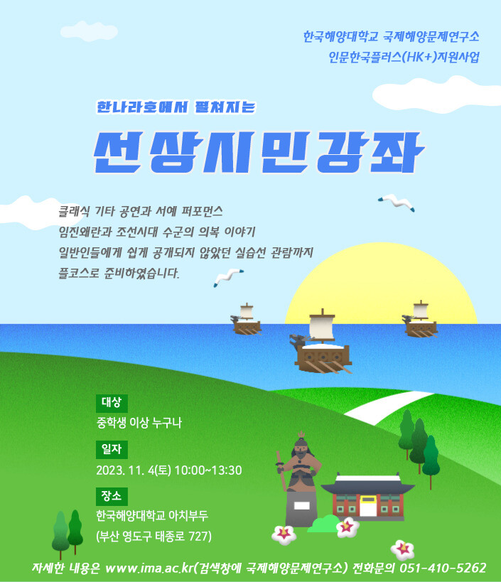 이번 ‘해양선상아카데미’는 ▲고충진 기타리스트의 감미로운 기타 공연 ▲김강식 교수의 조선시대 임진왜란사 ▲이주영 교수의 조선시대 수군의 의복 등에 관한 강연 ▲실습선 한나라호 주요 시설 관람 ▲김성장 소장의 초대형 붓글씨 퍼포먼스 등으로 진행할 예정이다.