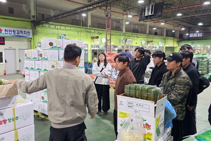 연암대 스마트원예계열 학생들이 천안 농수산물 도매시장에서 경매에 대해 설명을 듣고 있다. 사진=연암대 제공 |