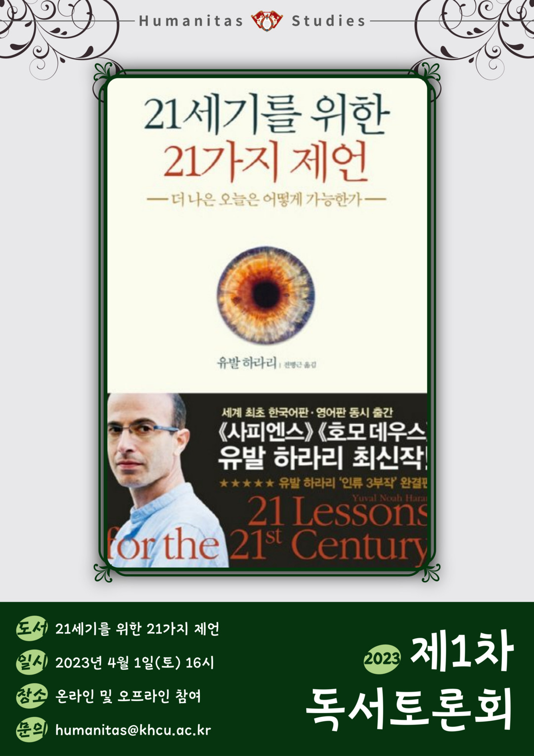 독서토론회 선정 도서는 유발 하라리의 ‘21세기를 위한 21가지 제언’이다. 유발 하라리는 역사학자이면서 생물학과 역사학 사이의 경계를 넘나들며 폭넓은 연구를 하고 있다. 인문학 분야에서 창의성 및 독창성을 가진 학자에게 주어지는 ‘폴론스키 상’을 2009년, 2012년 두 차례 수상했다.