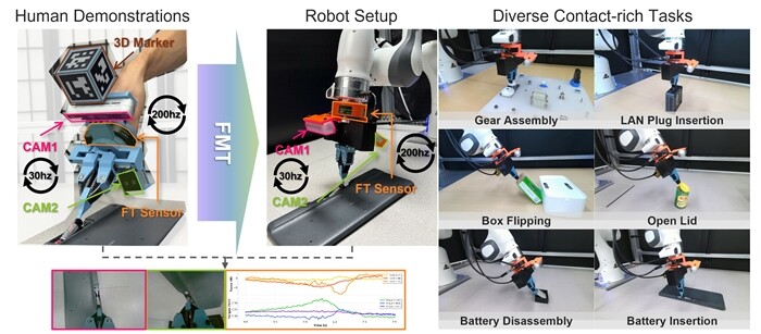 이 기술은 사람이 작업할 때 눈으로 보는 정보뿐 아니라 손끝에서 느끼는 힘과 접촉 감각까지 함께 학습하도록 한 것이 특징이다. 연구팀은 이를 위해 ‘손힘 측정 장치(ManipForce)’와 ‘주파수 인식 속도-감각 통합 AI 모델(Frequency-Aware Multimodal Transformer, FMT)’을 함께 개발했다.