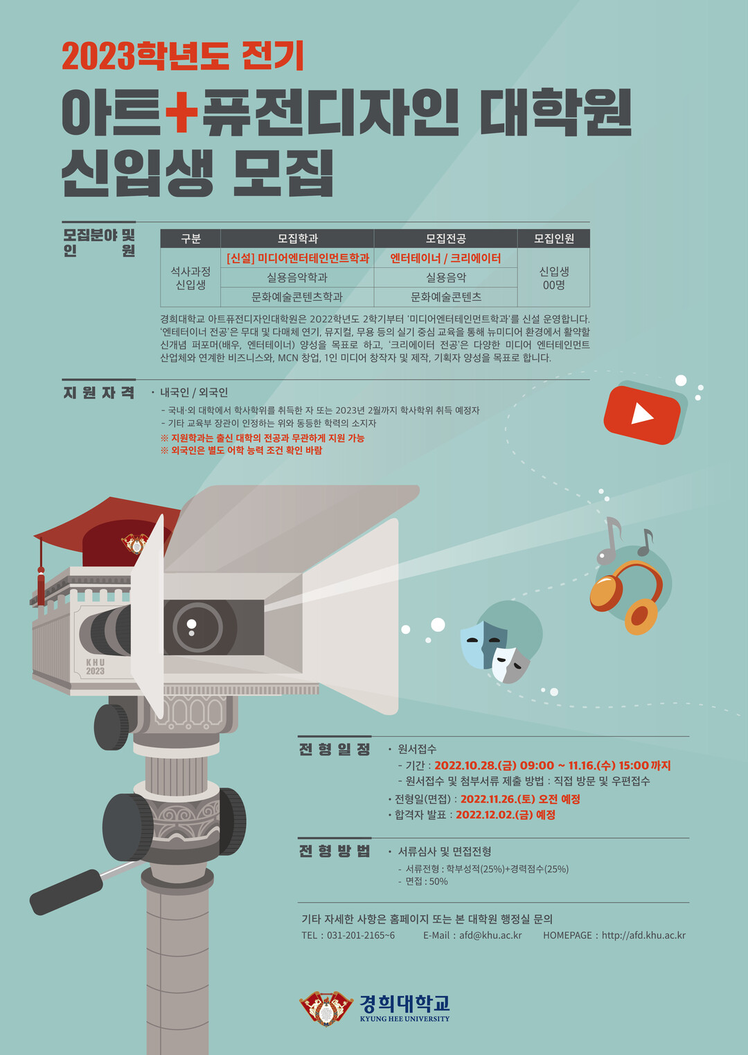 25일 경희대에 따르면 무대공연이 영상콘텐츠로 전환되고 오디션도 영상으로 보는 등 급변하는 시대적 변화에 따라 문화예술 콘텐츠의 디지털화와 인터넷 플랫폼 환경에 걸맞은 예술융합교육의 필요성을 느껴 이번 미디어엔터테인먼트학과를 신설했다.