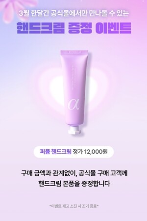 이번 이벤트는 건조해지기 쉬운 환절기, 고객들의 손 피부 건강을 위해 마련되었다. 3월 한 달 동안 닥터알파 공식몰에서 제품을 구매하는 모든 고객은 구매 금액과 관계없이 ‘닥터알파 퍼퓸 핸드크림(50ml)’ 본품을 선물로 받을 수 있다. 해당 이벤트는 준비된 재고 소진 시 조기 종료될 예정이다.