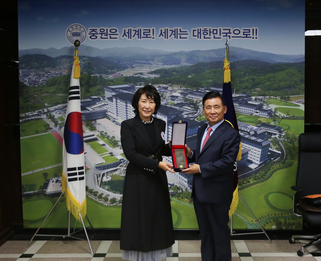 황윤원(오른쪽) 중원대 총장과 허혜숙 대한적십자사 충북혈액원장이 23일 감사패 전달식이 끝난 뒤 기념촬영을 하고 있다.사진=중원대 제공 |