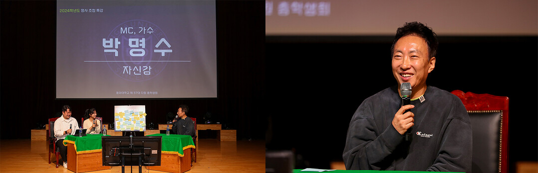 동아대 총학생회 주관 명사초청 특강에서 박명수 씨가 ‘자신감’을 주제로 특강을 진행하고 있다. 사진=동아대 제공 |