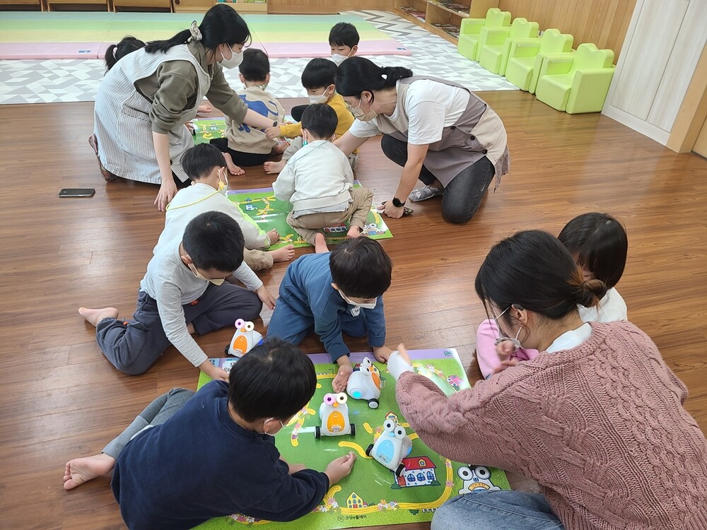 삼육보건대 아동보육과 학생들이 지역 어린이집에서 아동들과 게임놀이를 하면서 봉사활동하고 있다. 사진=삼육보건대 제공 |