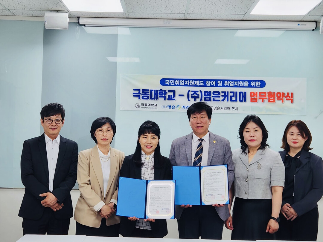 협약식에는 이서윤 ㈜명은커리어 대표, 박동섭 고양노인주야간보호센터 대표, 강장미 한마음 노인재가복지센터 대표, 이병도 학사모평생교육원 대표가 참석했고, 극동대에서는 이연수 사회복지학과장, 임은의 교양대학장, 유연웅 지역상생발전지원센터장, 박보영 교수 등이 참석했다.