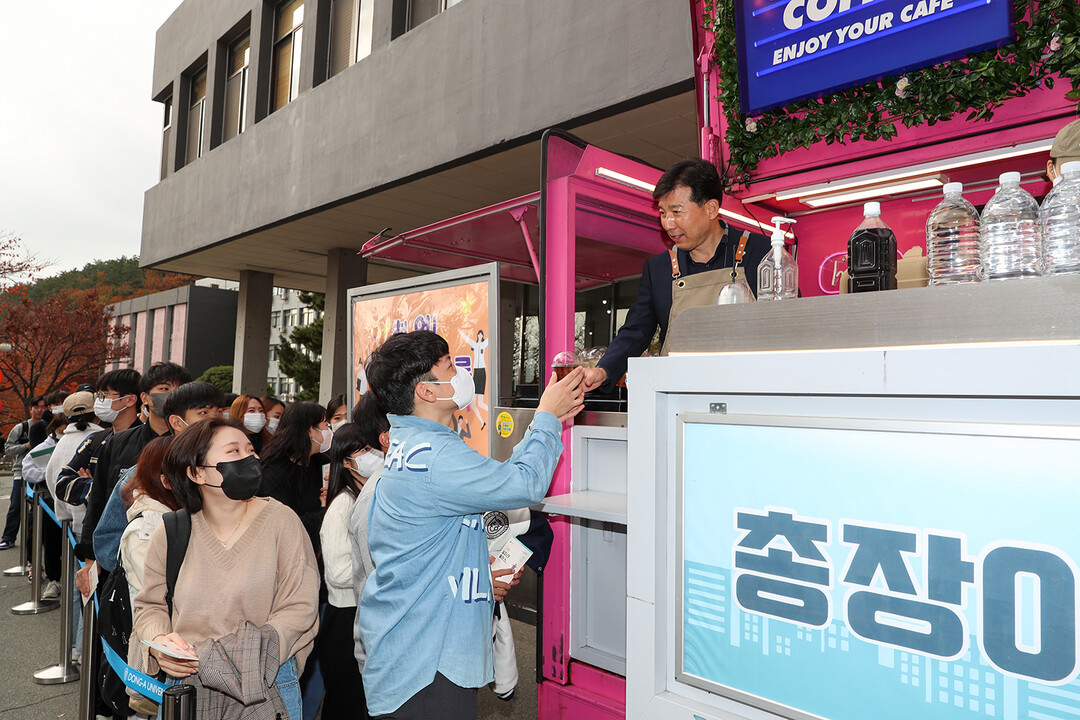동아대에 따르면 이 대학 대학일자리플러스센터와 취업지원실은 지난 14일 승학캠퍼스에서 ‘여러분의 꿈을 응원합니다’ 커피차를 운영했다. 이 총장이 직접 학생들에게 커피를 나눠주며 학생들을 격려했다.