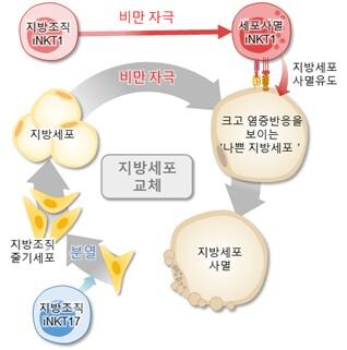 서울대학교 자연과학대학 생명과학부 김재범 교수 연구진과 POSTECH 김종경 교수 연구진은 최근 지방조직 내 면역세포의 일종인 불변성 자연살해 T (invariant natural killer T, iNKT) 세포가 지방세포 교체 과정에서 핵심적인 역할을 할 수 있음을 발견했다.