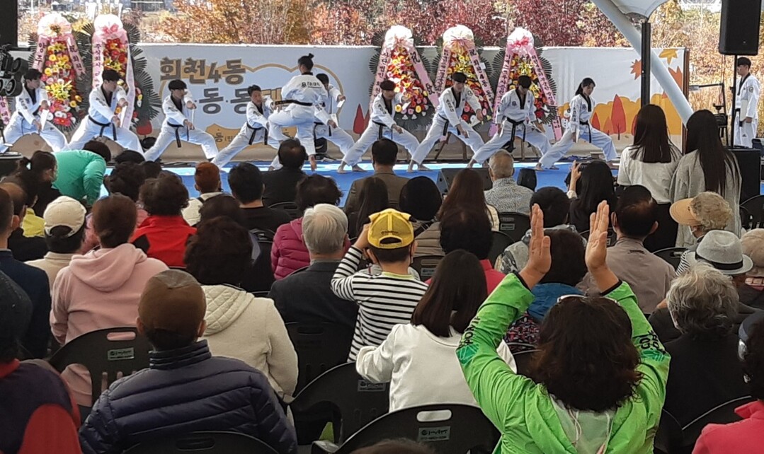 | 경동대 학생들이 경기도 양주 회천4동 마을행사 '동동동대축제'에서 태권도 시범 축하공연을 하고 있다. 사진=경동대 제공 |