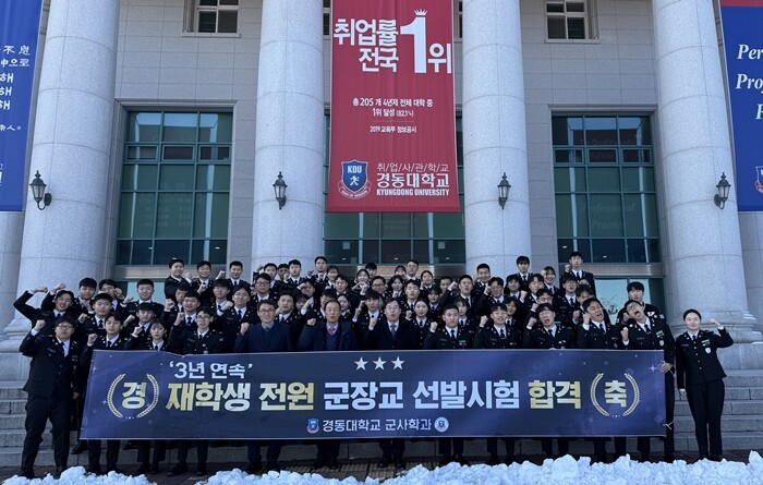 [대학저널 온종림 기자] 경동대학교 군사학과 1학년 전원이 장교와 군장학생 선발에 합격했다. 같은 학과 2~4학년도 이미 각 군 장교 선발시험과 대학등록금 전액 장학생 선발에 합격한 상태이다. 이에 따라 경동대 군사학과는 3년 연속 재학생 전원(부사관 희망자 2명 제외)이 장교와 장학생 합격이라는 성과를 일구었다.