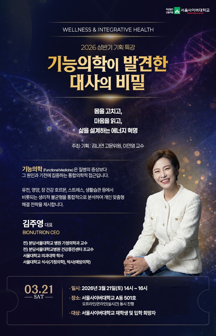 서울사이버대 이민영 교수(통합건강관리학과장)는 “기능의학을 더 가까이 접할 기회를 제공하기 위하여 이번 2026 상반기 기획 특강을 마련했다”라며 “앞으로도 서울사이버대 통합건강관리학과는 재학생들을 위한 다채로운 교육 커리큘럼을 제공하기 위하여 최선의 노력을 기울일 것이다”라고 말했다.