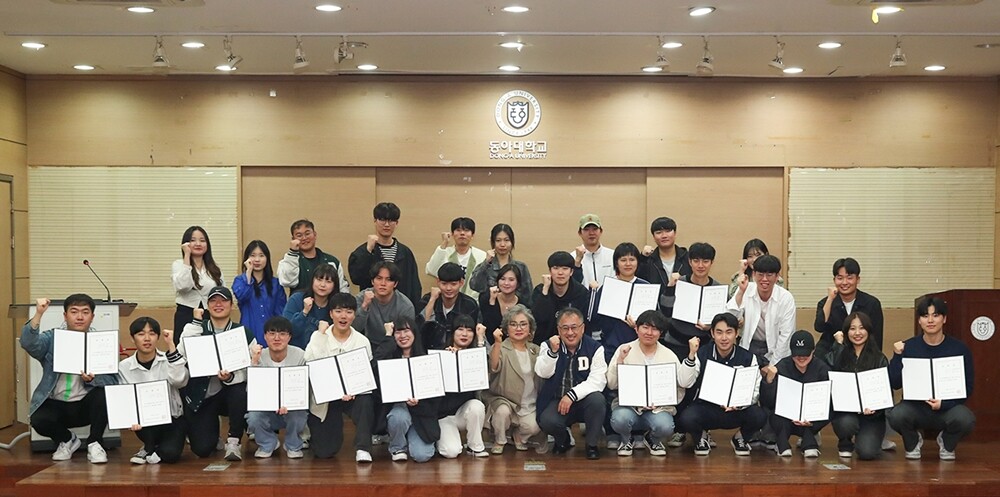 지난 27일 동아대 승학캠퍼스 청촌홀에서 열린 제10기 동아 재능기부봉사단 임명장 수여식 참석자들이 기념촬영을 하고 있다. 사진=동아대 제공 |