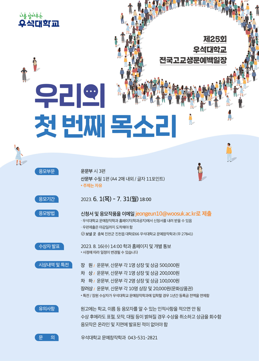 응모 기간은 7월 31일 오후 6시까지며, 문예창작학과 홈페이지에서 신청서를 내려받아 작성한 뒤 응모작품과 함께 이메일 또는 우편(충북 진천군 진천읍 대학로 66 우석대학교 문예창작학과·우편번호 27841)을 통해 제출하면 된다.