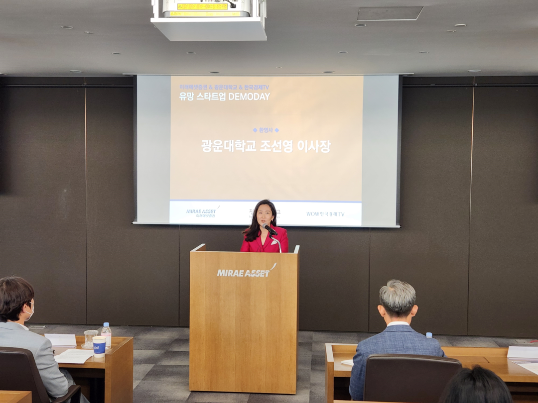 | 조선영 광운학원 이사장이 미래에셋증권, 광운대, 한국경제TV의 ‘유망 스타트업 DemoDay’에서 환영사를 하고 있다. 사진=광운대 제공 |