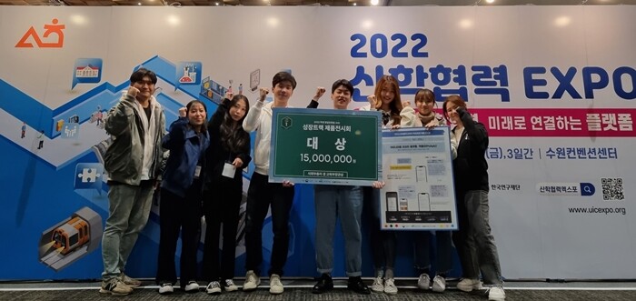 2022년 산학협력 EXPO 학생창업페스티벌 성장트랙 제품전시회 대상을 수상한 김동호 대표(왼쪽에서 5번째). |