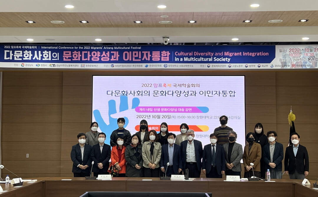 창원대가 지난 20~21일 한국이민학회와 공동으로 주최한 ‘MAMF(맘프) 2022 기념 국제학술회의’가 끝난 뒤 관계자들이 기념촬영을 하고 있다. 사진=창원대 제공 |