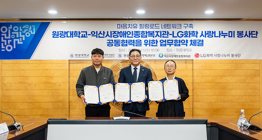 [대학저널 이선용 기자] 원광대학교는 지난 11일 대학본관 회의실에서 익산시장애인종합복지관, LG화학 사랑나누미 봉사단과 함께 장애 인식 개선과 무장애 환경 확산을 위한 업무협약을 체결했다.