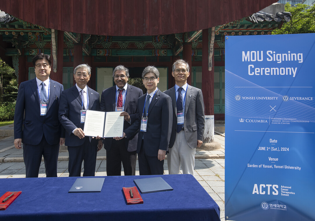 왼쪽부터 금기창 연세의료원장, 윤동섭 연세대 총장, 아닐 러스트기 컬럼비아대 암센터장, 정재호 연세대 YSP추진본부장, 이종수 연세대 국제캠퍼스 부총장. |