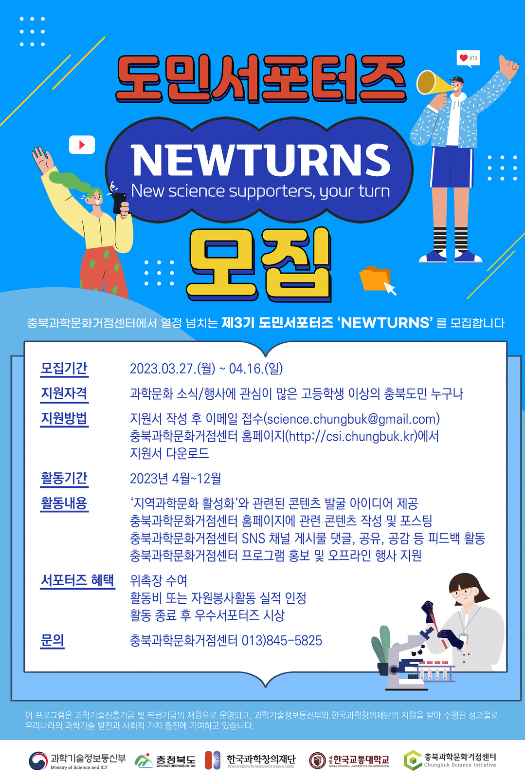 도민서포터즈 NEWTURNS로 활동하고 싶은 도민은 충북과학문화거점센터 홈페이지(https://cbscience.judeed.com/)에서 관련 내용을 확인해 오는 16일까지 신청하면 된다. 자세한 내용은 충북과학문화거점센터(043-845-5825)로 문의하면 된다.