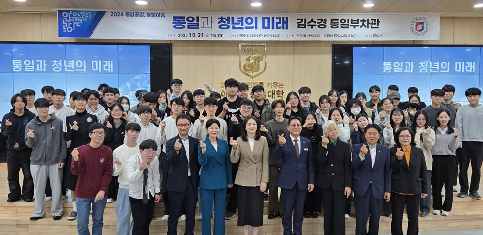 [대학저널 이선용 기자] 원광대학교 통일교육사업단이 김수경 통일부차관과 함께 ‘통일과 청년의 미래’ 특강을 지난달 31일 교내 프라임관 컨퍼런스홀에서 개최했다고 5일 밝혔다.