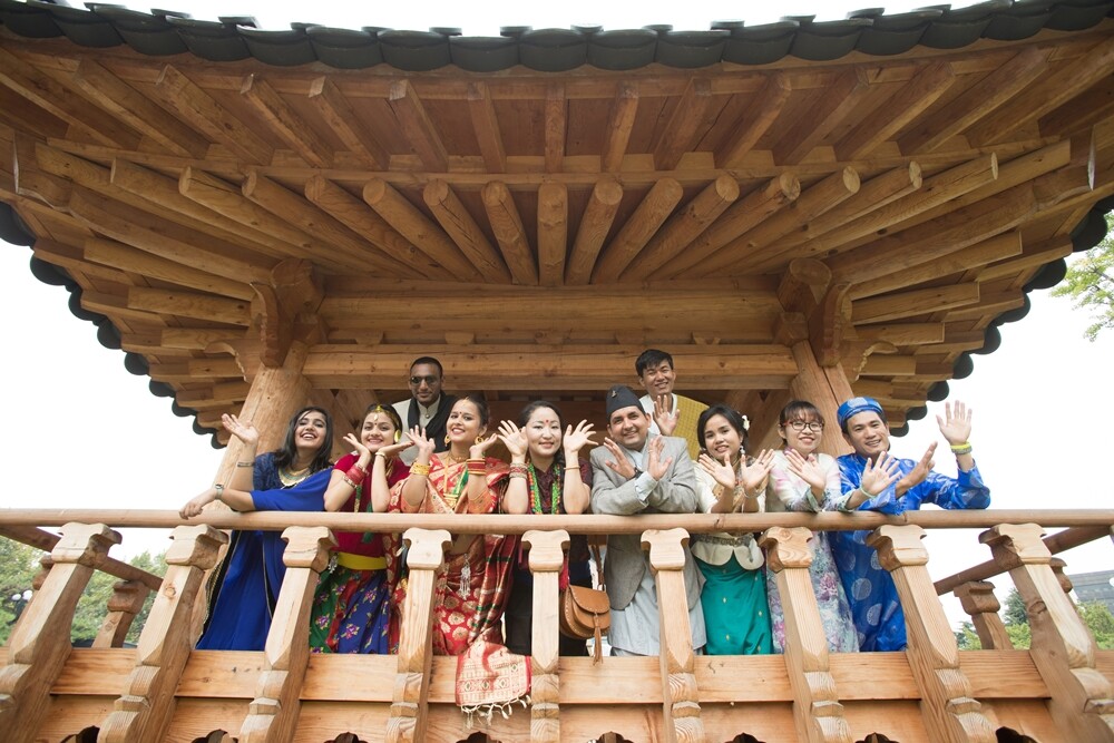 전북대 외국인 유학생들이 교내 명소인 정자에서 사진촬영을 하고 있다. 사진=전북대 제공 |