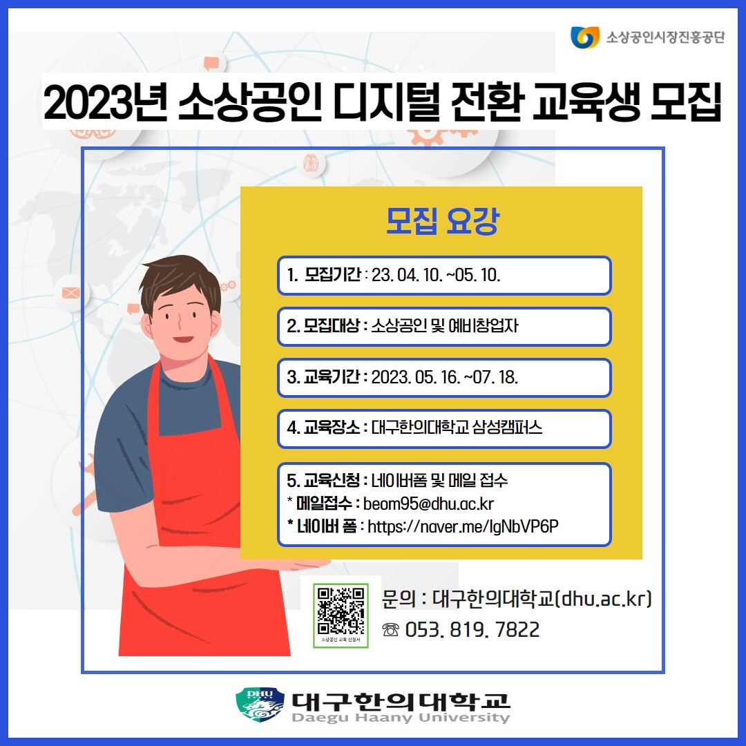 수강인원은 50명 내외이며, 문의는 대구한의대 소상공인디지털전환지원센터로 하면 된다.