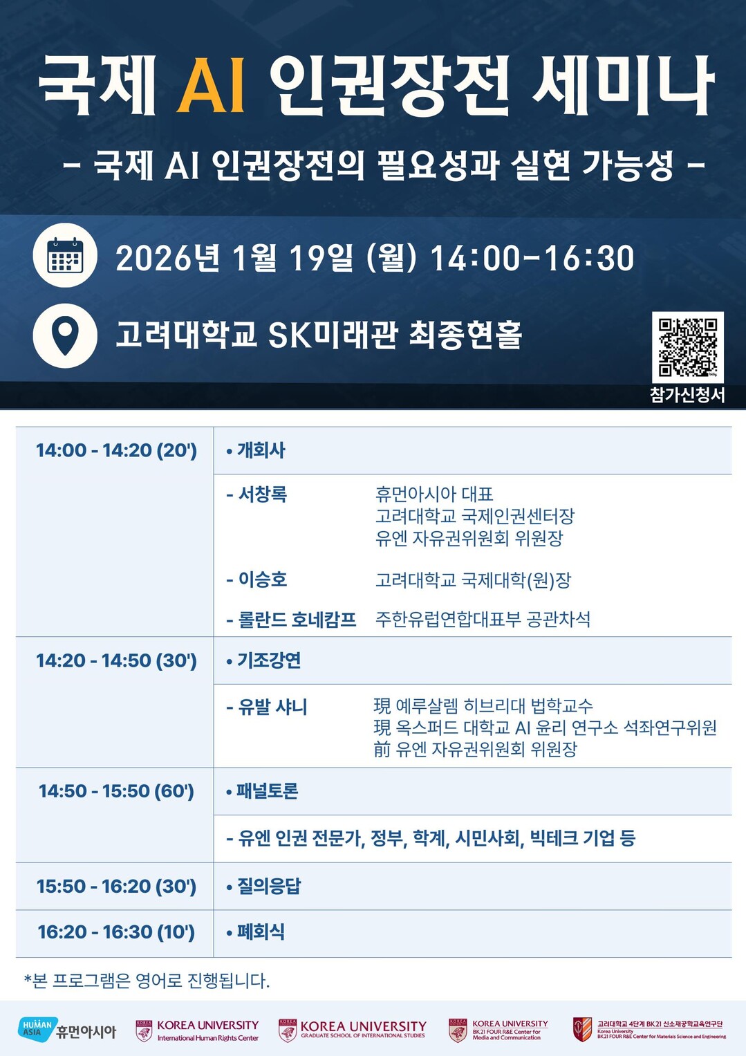 고려대는 사단법인 휴먼아시아와 공동으로 오는 1월 19일 오후 2시, SK미래관 최종현홀에서 ‘국제 AI 인권장전 세미나’를 개최한다고 15일 밝혔다.