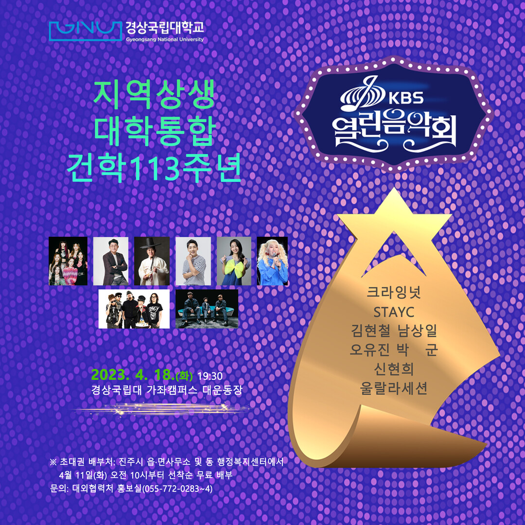 열린음악회의 초대권은 11일 오전 10시부터 진주 시내 동 행정복지센터와 읍·면 사무소에서 선착순 무료 배부한다. 관객은 오후 6~7시에 입장한다. 녹화한 열린음악회는 경상국립대 건학 113주년 기념일인 4월 30일 오후 5시 40분부터 80분간 KBS 1TV에서 방송한다.