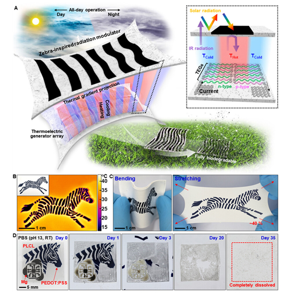 [대학저널 온종림 기자] 고려대학교 KU-KIST 융합대학원 황석원 교수와 광주과학기술원 송영민 교수 연구팀은 얼룩말 모사 패턴으로 온도를 제어하고, 이를 열전 현상에 의해 전기로 변환하는 생분해성 발전 시스템을 개발했다.