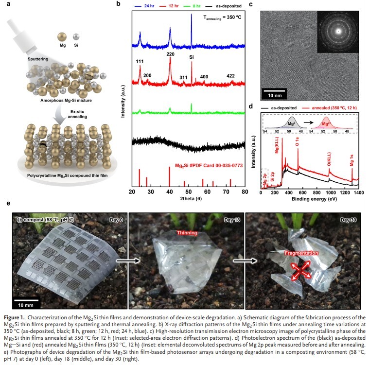 김 교수는 일정 기간 안정적으로 작동한 후 특정 환경에 노출되면 흔적 없이 녹아 분해되는 친환경 반도체 소재 마그네슘 실리사이드(Mg₂Si)가 실제 적용 가능한 반도체임을 입증한 논문 ‘Dissolution study of biodegradable Magnesium Silicide thin films for transient electronic applications’를 SCIE 저명 국제학술지 에 최근 게재했다. 이 연구는 생분해성 전자소자(Transient Electronics) 구현 가능성을 실험적으로 검증했다는 점에서 학술적·산업적 가치를 인정받았다.