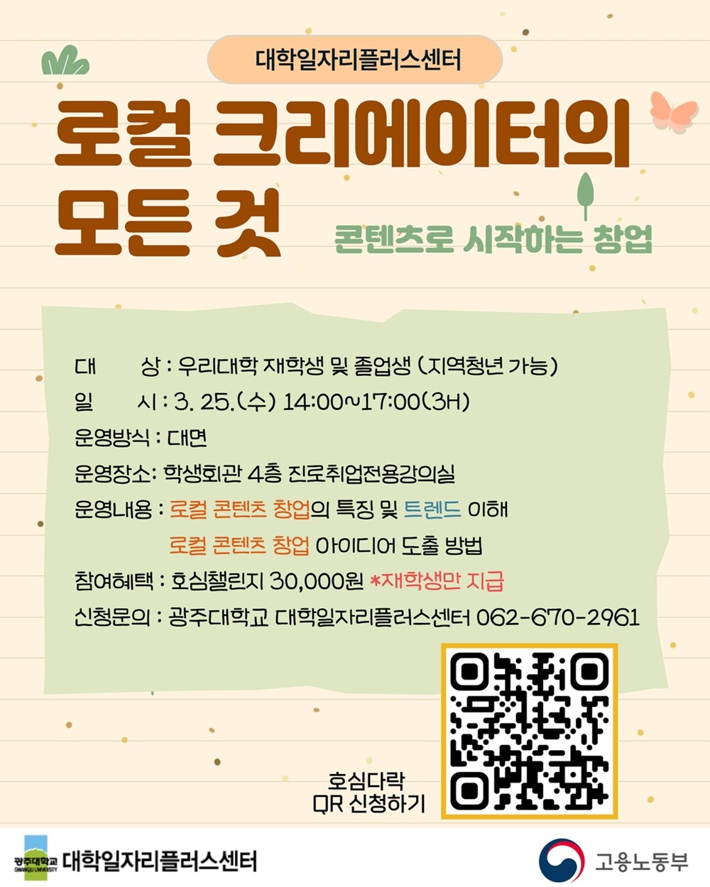 대학일자리플러스센터는 오는 25일 오후 2시부터 5시까지 교내 학생회관 4층 진로취업전용강의실에서 ‘2026학년도 로컬 크리에이터의 모든 것: 콘텐츠로 시작하는 창업 특강’을 진행한다.