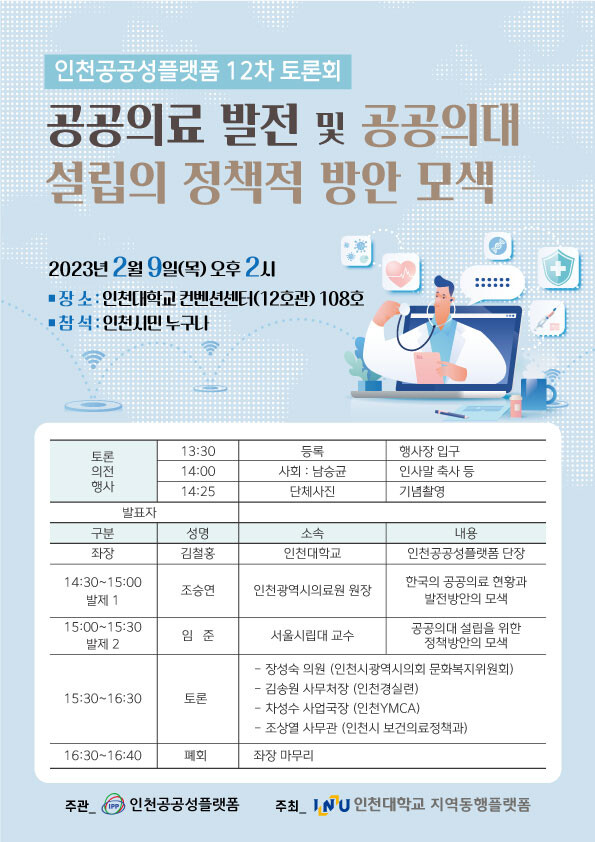 이어 장성숙 인천시의회 의원, 김송원 인천경실련 사무처장과 차성수 인천YMCA 사업국장, 조상열 인천시 보건의료정책과 사무관이 공공의료 발전과 공공의대 설립의 정책적 방안 등을 논의할 예정이다.