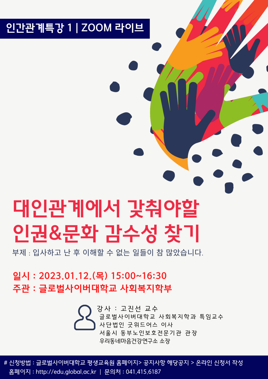 글로벌사이버대는 오는 26일에는 인간관계 특강 시리즈 두 번째로 ‘치매환자를 돌보는 자세와 의사소통 기술’을 주제로 한 특강을 할 예정이다