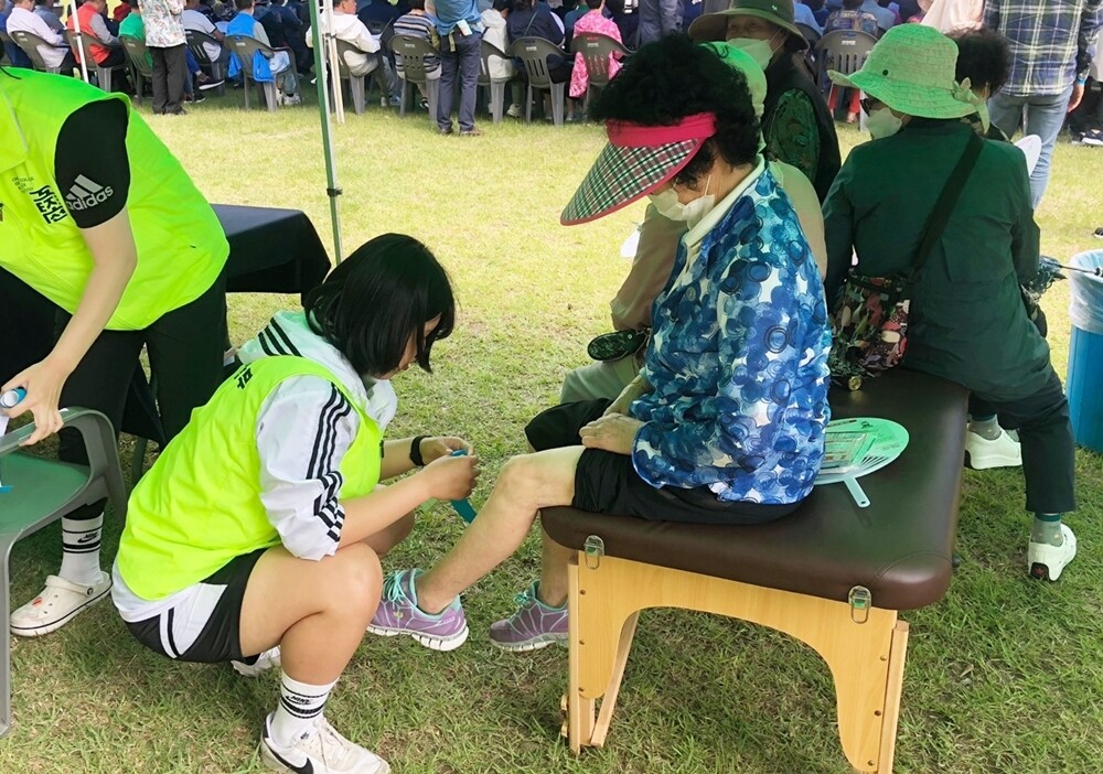 조선이공대 학생들이 지역 어르신들에게 스포츠 테이핑을 하고 있다. 사진=조선이공대 제공 |