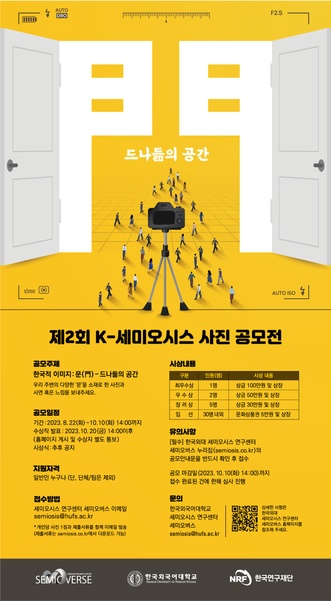 공모전을 기획한 한국외대 세미오시스 연구센터 서종석 센터장은 “일상에서 마주치는 다양한 ‘문’이 이번 공모전의 주제이다. 건물의 문과 창문, 각종 교통수단의 문, 동물을 위한 문 등 여러 가지 ‘문’에 대한 이야기와 느낌을 사진에 담아 보내주기 기대한다”고 밝혔다.