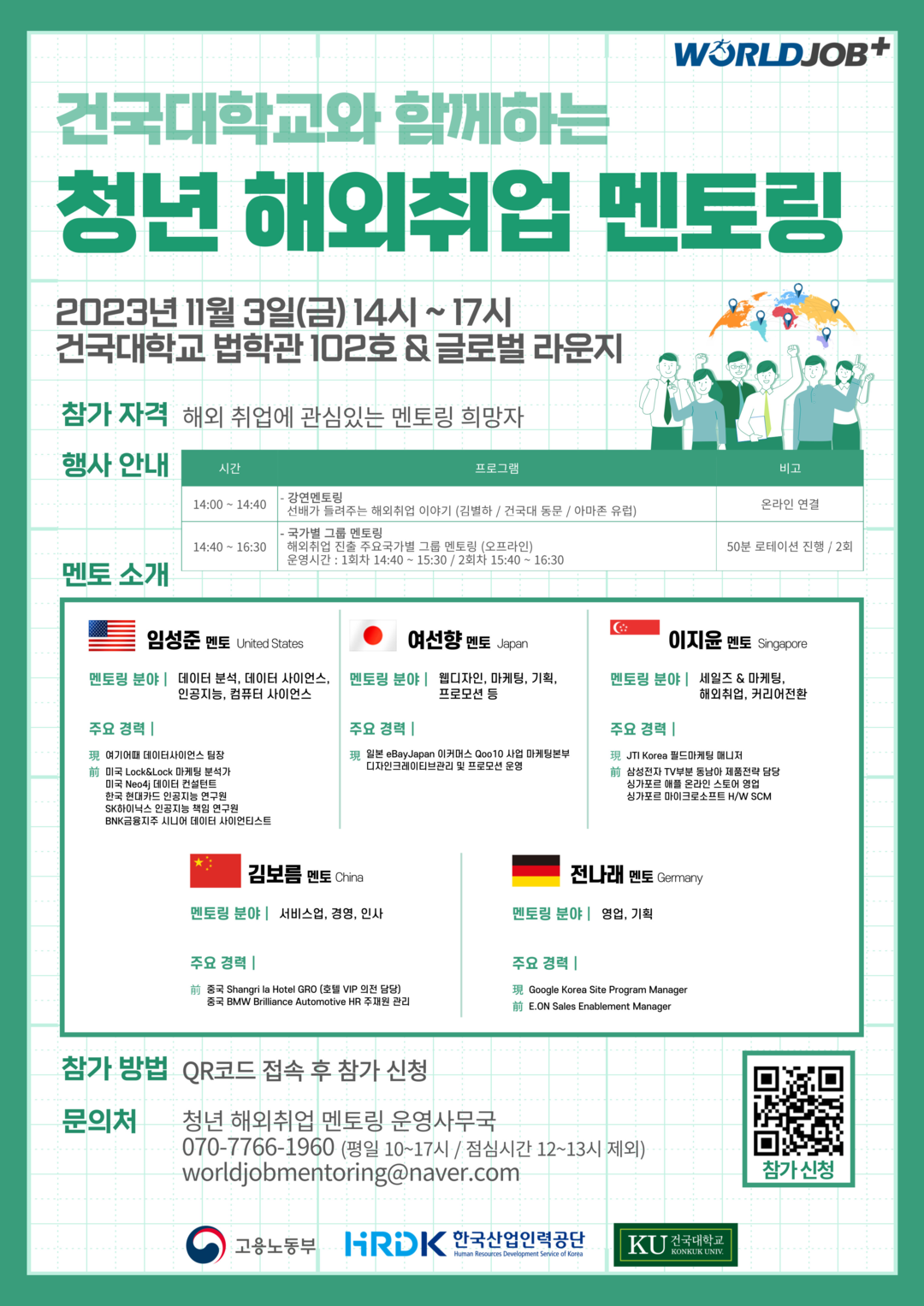 이번 행사는 도전적인 해외진출을 꿈꾸고 있는 청년을 지원하기 위해 한국산업인력공단 주최, 건국대 후원으로 마련됐다. 두 가지 멘토링 프로그램으로 구성된다.
