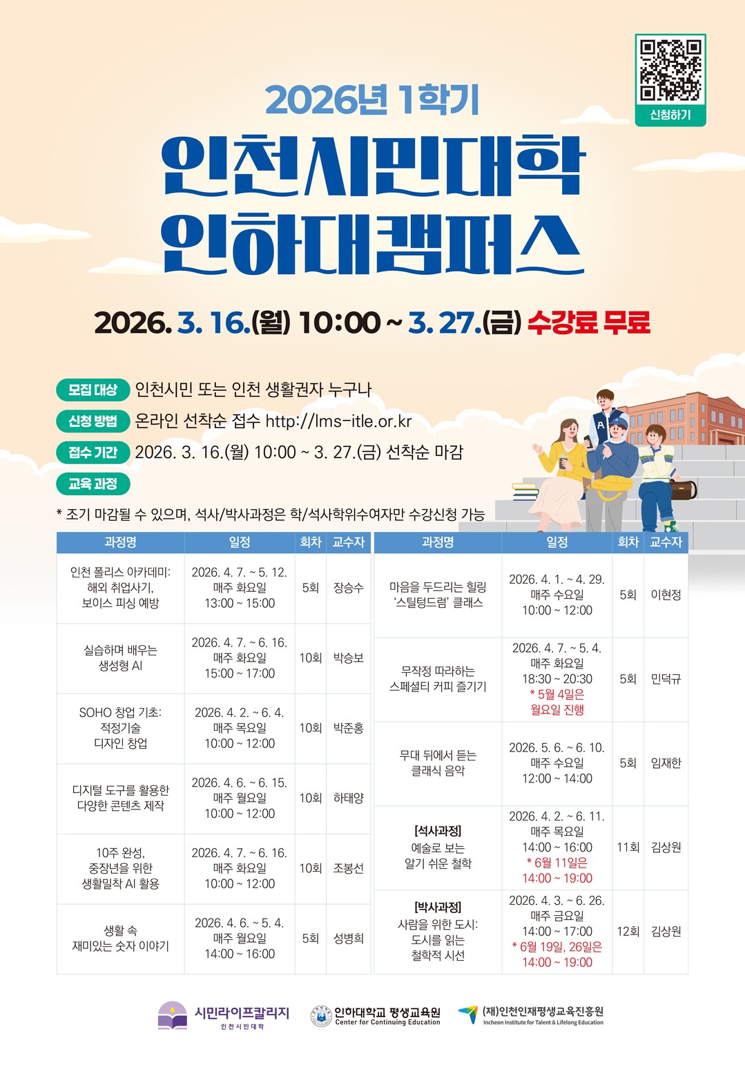 인천시민대학 시민라이프칼리지 인하대 캠퍼스에는 인천시민이나 인천 생활권자면 누구나 참여할 수 있고, 수강료는 무료다. 수강 신청은 3월 16일부터 27일까지 진행되며, 선착순 마감된다.