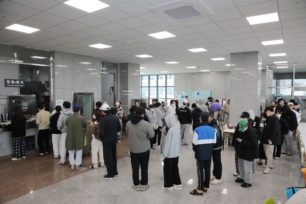가천대 학생들이 21일 대학 제3학생생활관 식당에서 조식을 먹기 위해 줄을 서 있다. |