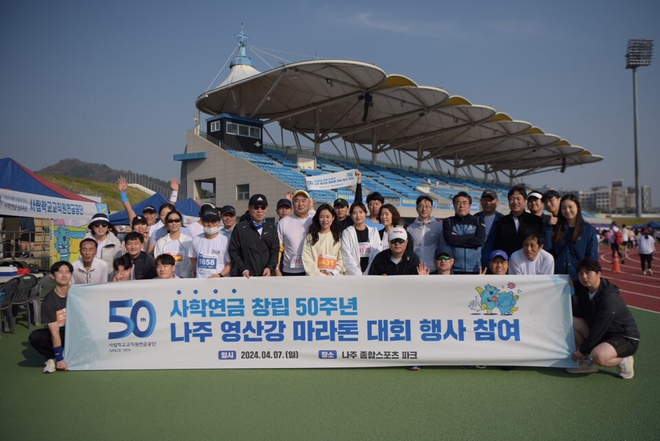 사학연금이 7일 제10회 나주 영산강 마라톤 대회에 사학연금 창립 50주년을 맞아 교직원들과 사학연금 임직원들이 참여했다. 사진=사학연금 제공 |