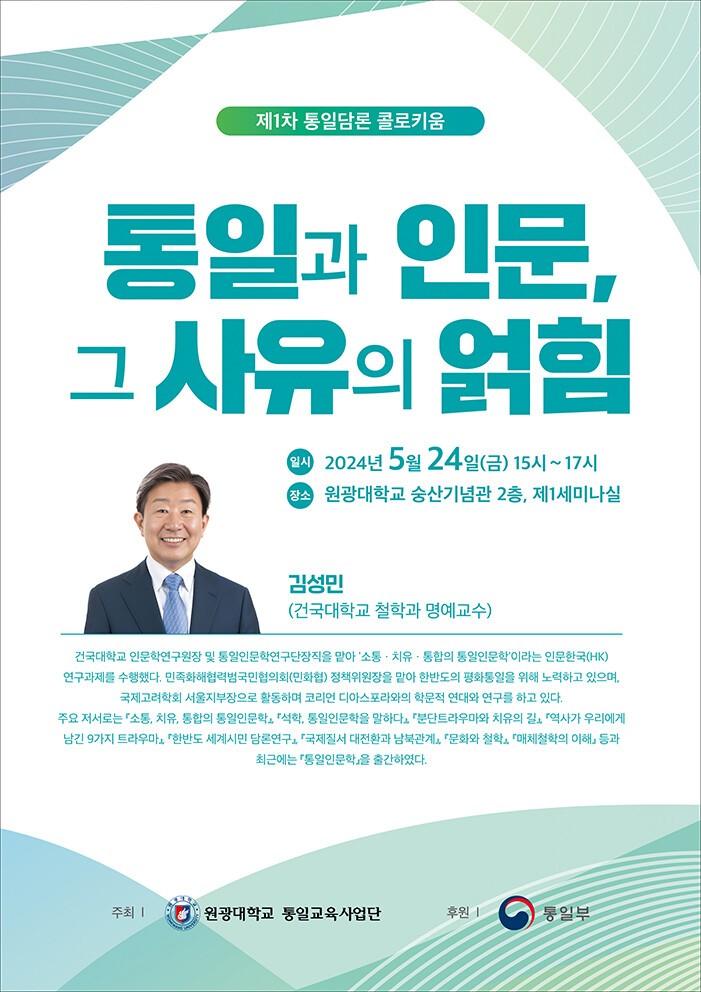 ‘통일과 인문, 그 사유의 얽힘’을 주제로 진행되는 이번 1차 콜로키움은 건국대 철학과 김성민 명예교수를 초청했으며, 김성민 교수는 건국대에서 통일인문학연구단장을 맡아 ‘소통·치유·통합의 통일인문학’을 중심으로 인문한국(HK) 연구 과제를 수행하고, 민족화해협력범국민협의회 정책위원장과 국제고려학회 서울지부장직을 수행했다.