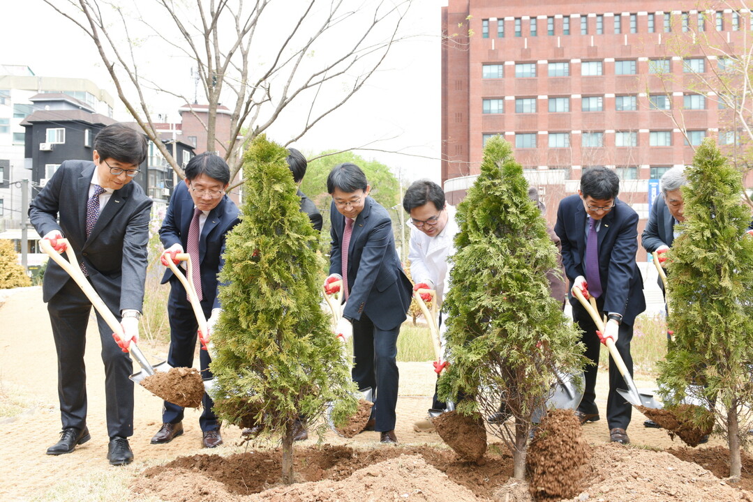중앙대 관계자들이 최근 후문 일대에 흑석 창업숲마당을 조성하고 기념식수를 하고 있다. 사진=중앙대 제공 |