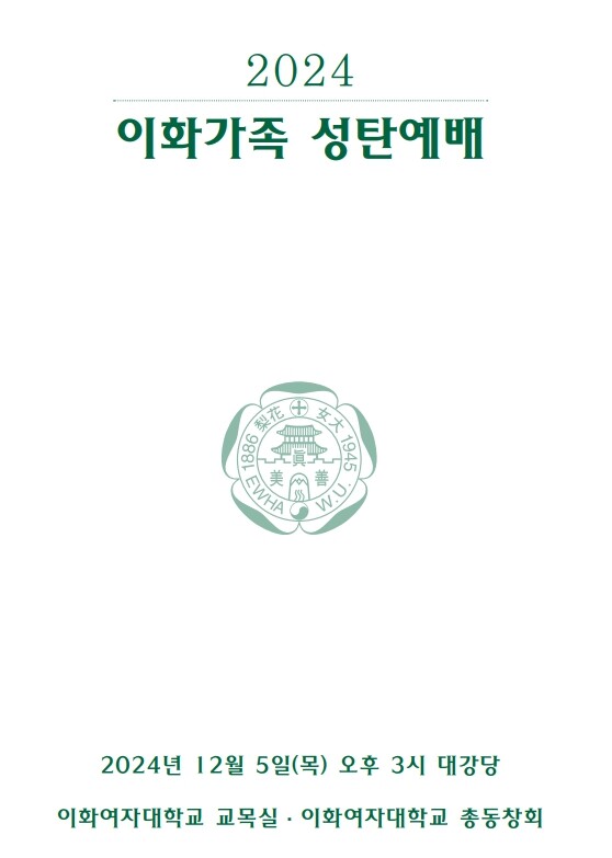 먼저 이화여대 교수, 직원, 학생, 동창으로 구성된 4인이 ‘이화성탄기도’를 함께 올리며 서로의 삶 속에 감사와 평화가 깃들기를 기원한다. 이어 이명경 총동창회장이 성경을 봉독하고 안선희 교목실장이 ‘이번엔 우리 차례’라는 제목의 성탄 메시지를 전달한다. 김은미 총장은 성탄 인사를 통해 이화 가족을 향한 사랑과 감사의 마음을 전하고 섬김과 나눔의 이화정신을 되새기는 시간을 갖는다. 성탄예배를 축하하기 위해 이화여대 음대 합창단과 타악기앙상블의 ‘오 거룩한 밤’, ‘베텔레헴무’ 공연, 이화여대 무용과의 축하무용이 진행돼 참석자들에게 특별한 기쁨을 선사할 예정이다.