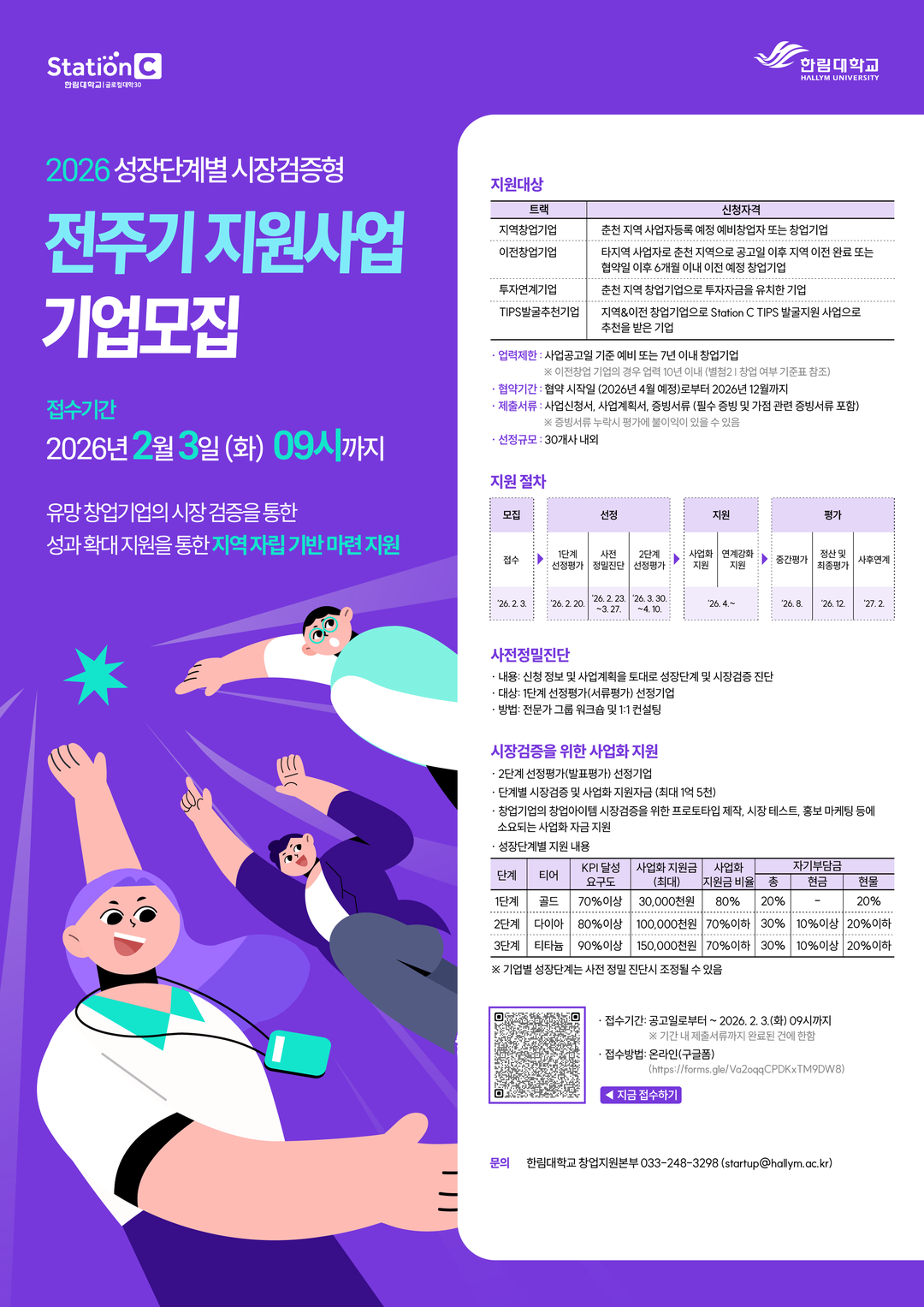 이번 사업은 단순 자금 지원에서 벗어나 유망 기업을 발굴해 사전진단, 시장검증, 후속투자 연계까지 전 과정을 지원하는 한림대학교만의 차별화된 ‘전주기 지원 프로그램’이다. 지난해에는 총 36개의 유망 창업기업을 선정해 지원하며 지역 창업 생태계 활성화에 기여한 바 있으며, 올해는 1차로 상반기에 약 30개사 내외를 선정해 지원을 이어갈 방침이다.