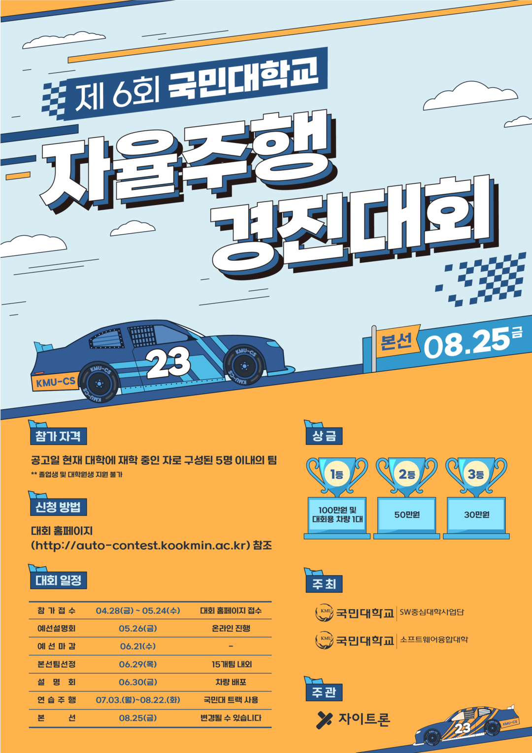 본선대회는 오는 8월 25일 국민대 자율주행스튜디오에서 열리며, 유튜브로 실시간 중계될 예정이다. 1등팀에게는 국민대 총장 명의의 상장과 상금 100만원, 대회용 차량 1대가 수여된다. 2등과 3등 팀에게도 상장과 각각 50만원, 30만원의 상금이 수여된다.