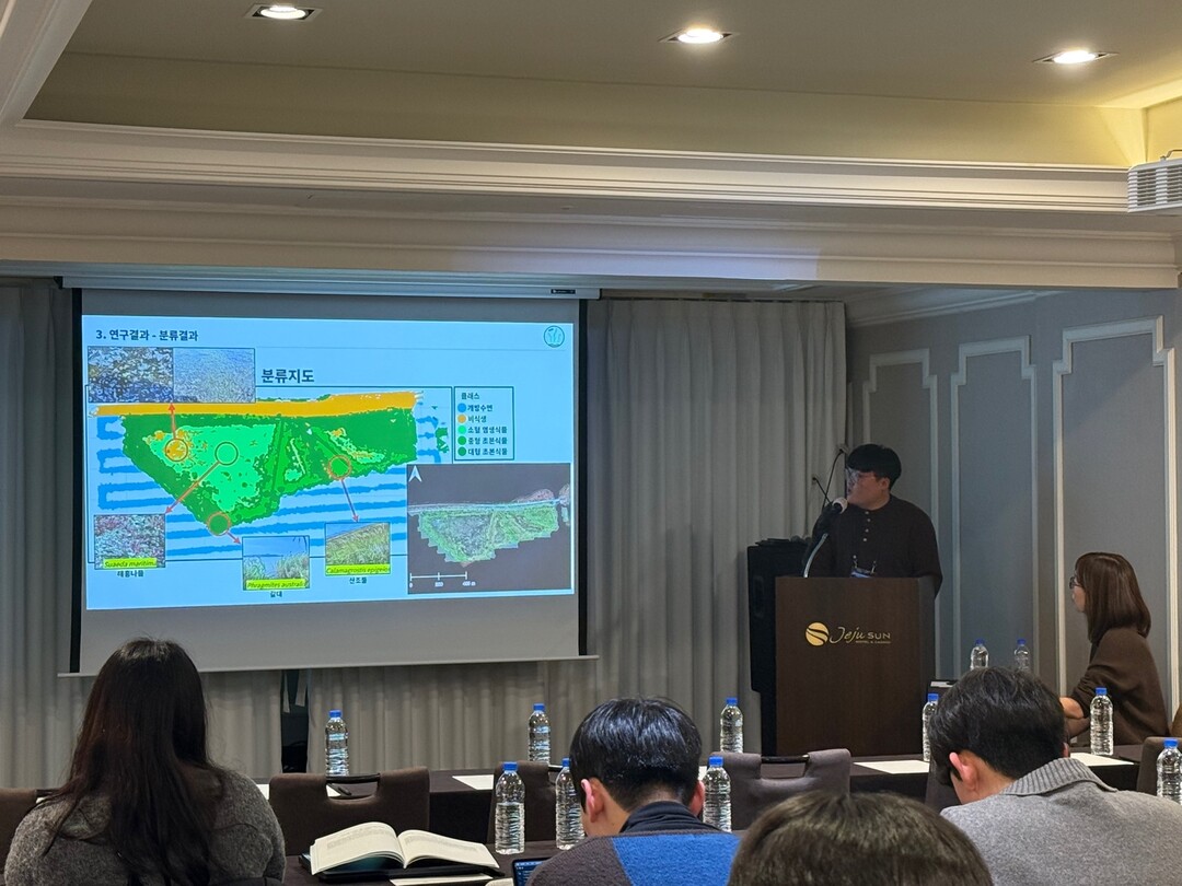 홍동완 학생은 ‘UAV-LiDAR를 활용한 염습지 식물 군락 분류 및 서식처 특성 분석’을 주제로 구두발표를 진행해 최우수발표논문상을 수상했다. 해당 연구는 무인기(UAV)와 라이다(LiDAR) 센서를 활용해 획득한 3차원 공간정보에 기계학습 알고리즘을 적용, 새만금 염습지 식물 군락을 정밀하게 분류한 것이다. 접근이 어려운 염습지 생태계의 구조적 특성을 입체적으로 분석하고, 향후 연안 생태계 보전과 관리에 활용할 수 있는 과학적 기반을 제시했다는 점에서 높은 평가를 받았다.