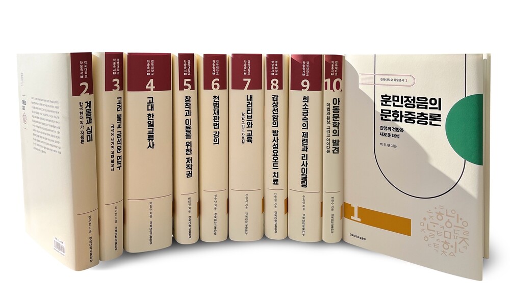 이번에 발간된 학술총서는 훈민정음을 새롭게 해석한 ‘훈민정음의 문화중층론’(백두현 명예교수)을 시작으로 ‘계몽과 심미’(김주현 교수), ‘고려 불교 금석문 연구’(한기문 교수), ‘고대 한일교류사’(박천수 교수), ‘창작과 이용을 위한 저작권’(배대헌 교수), ‘헌법재판법 강의’(성중탁 교수), ‘내러티브와 교육’(강현석 교수), ‘갑상선암의 방사성요오드 치료’(안병철 교수), ‘희소금속의 제련과 리사이클링’(손호상 교수), ‘아동문학의 발견’(변학수 교수) 등 10권이다.