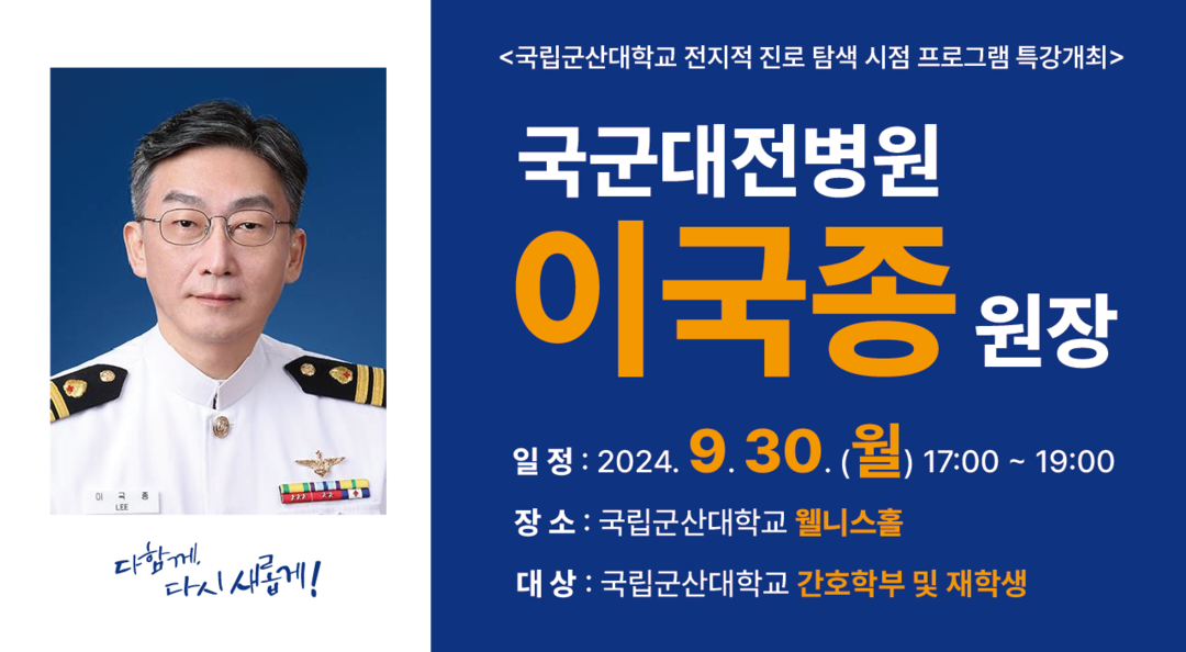 [대학저널 이선용 기자] 국립군산대학교가 오는 30일 오후 5시부터 7시까지 교내 웰니스홀에서 전지적 진로탐색 시점 프로그램의 일환으로 국군대전병원 이국종 원장을 초청해 특강을 개최한다.