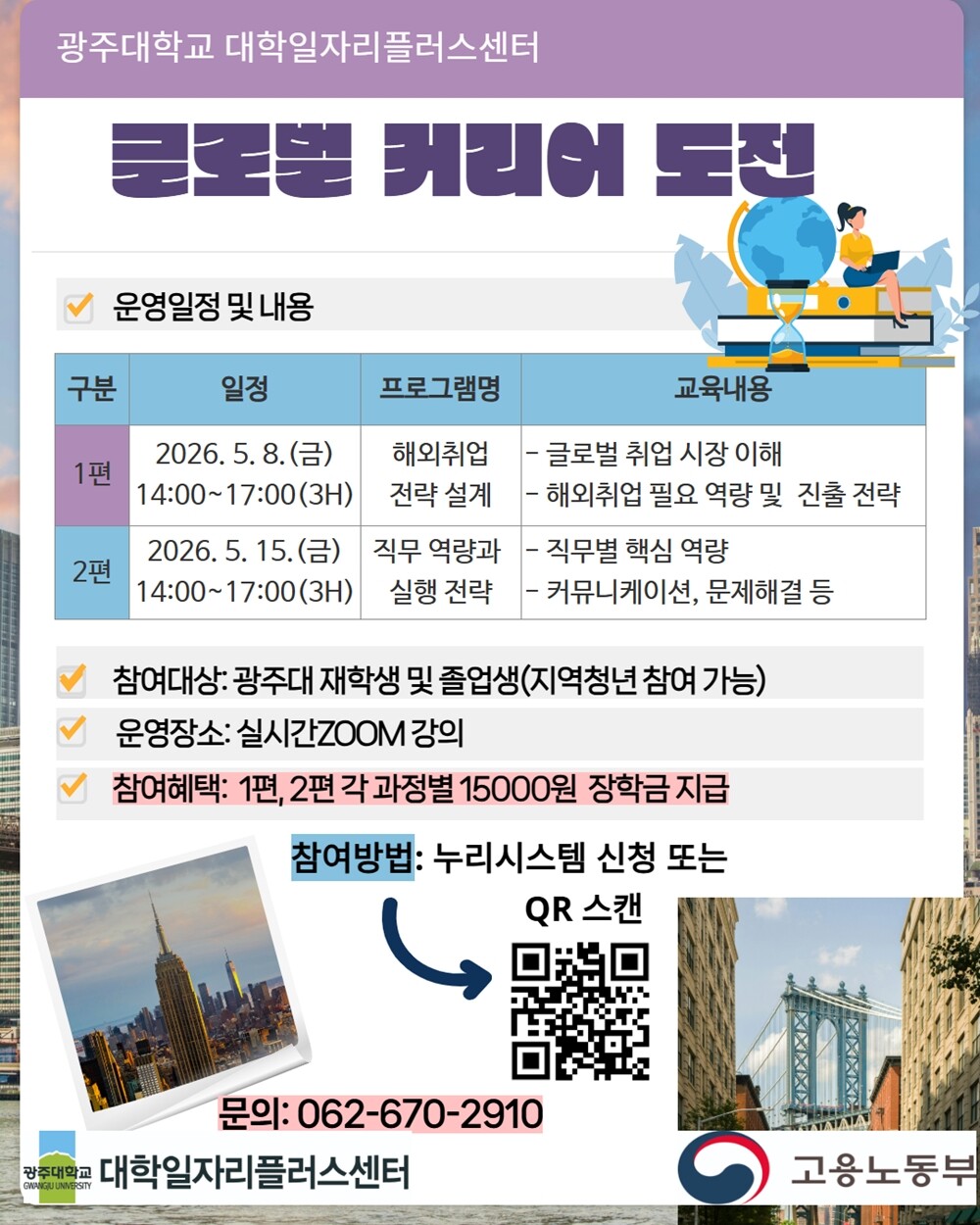 총 2회에 걸쳐 운영되며, 1차는 오는 5월8일 해외취업 전략을, 2차에서는 5월15일 직무역량 중심 교육을 제공한다. 모든 과정은 실시간 온라인으로 운영되며, 재학생 참여자에게는 기준 충족 시 장학금이 지원된다.